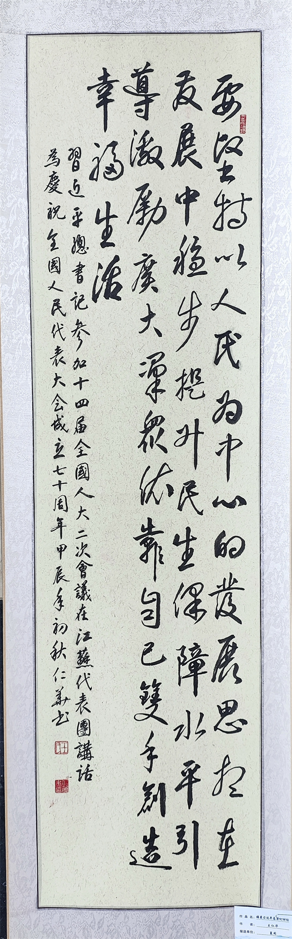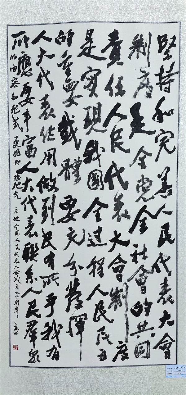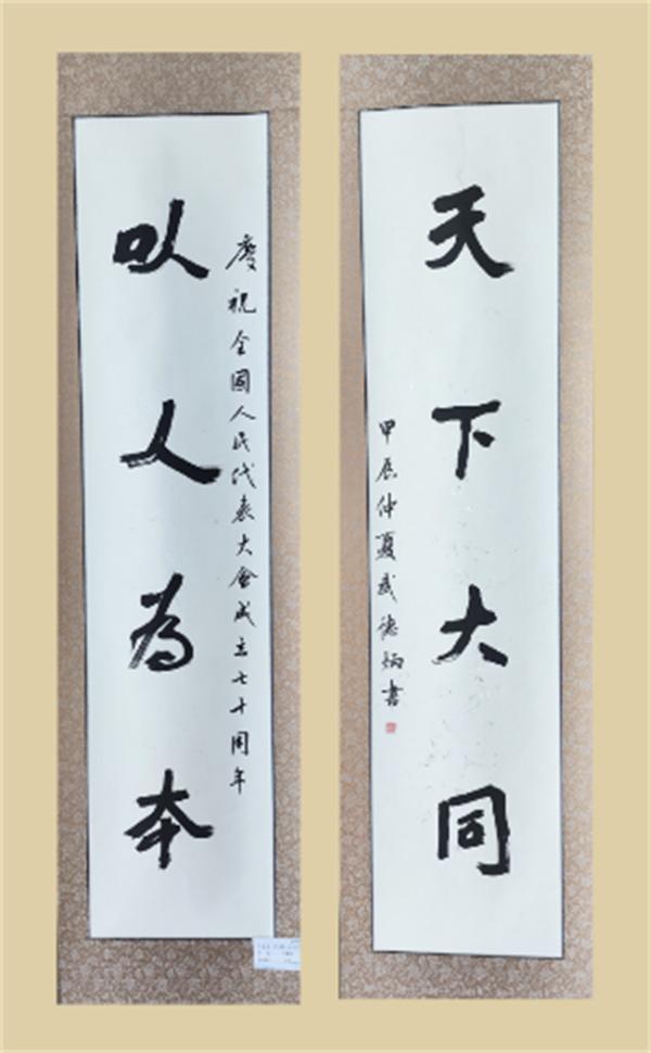 为庆祝全国人民代表大会成立70周年,巢湖市人大常委会以“翰墨庆华诞 丹青绘新篇——庆祝全国人民代表大会成立70周年”为主题举办书画展,回顾人民代表大会制度建立和发展的历程。全市人大工作者及人大系统离退休老同志、历届人大代表积极响应,围绕人民代表大会制度发展历程、民主法治建设、人大工作创新实践以及人大代表履职风采等方面,精心创作了数十幅高质量的书画作品,思想性与艺术性兼备,向全国人民代表大会成立70周年献礼。