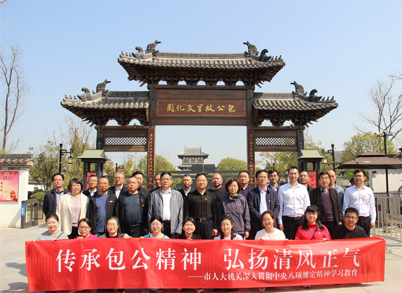 为深入贯彻中央八项规定精神,加强党风廉政建设,4月8日,市人大机关组织赴包公故里文化园开展廉政教育现场教学。市人大常委会党组书记、主任吴明哲,市人大常委会副主任程素萍、杭行、李安洲,机关30余名党员干部参加活动。